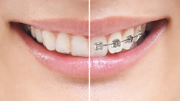 従来の矯正治療(ワイヤー矯正)は、金属製の矯正装置を接着剤で歯に固定し、歯並びを改善します。